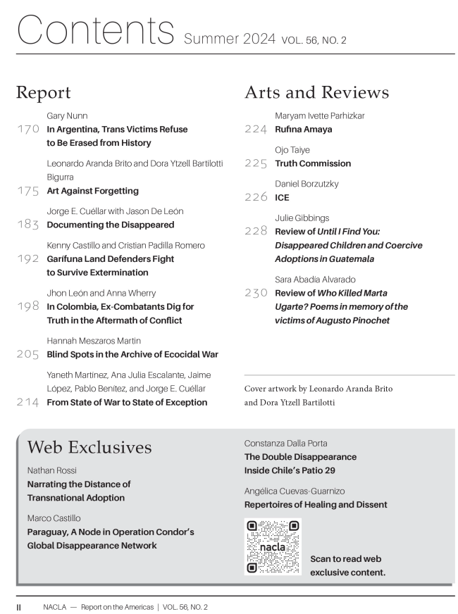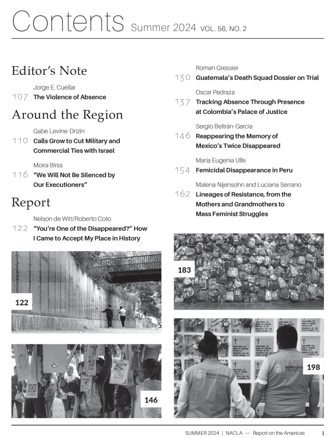 The Summer 2024 NACLA Report is out and was guest edited by Professor Jorge Cuéllar. The issue takes an incisive, transregional and transhistoric look at disappearance, past and present. Check out the table of contents below and click through to subscribe: https://nacla.org/edition/56-2/